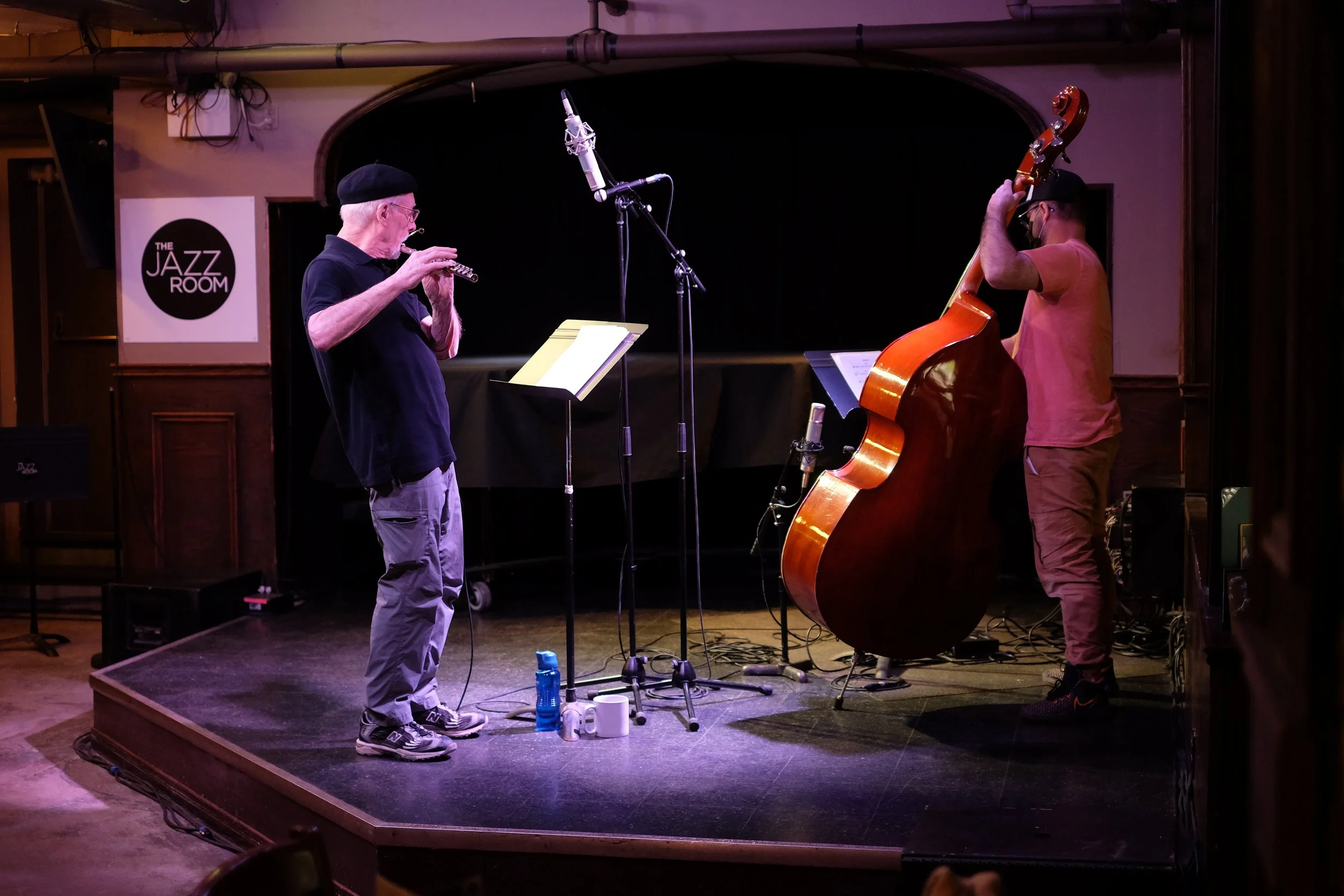 MOTIF. Doug Wicken (flute) and Tyler Wagler (double bass) recording at The Jazz Room, Waterloo, Ontario. May 15 and 16, 2023. Photo by Scott Wicken